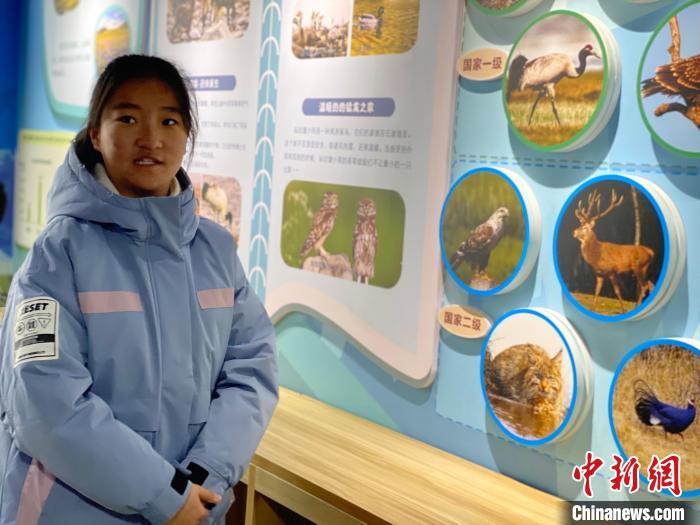圖為多杰吉在祁連山國家公園生態(tài)學(xué)校自然教室為參觀者進行講解。李江寧 攝