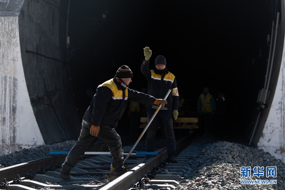 中國(guó)鐵路青藏集團(tuán)公司格爾木工務(wù)段秀水河線路車間的職工在風(fēng)火山隧道口進(jìn)行撥道作業(yè)。