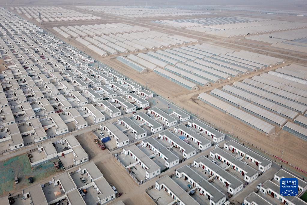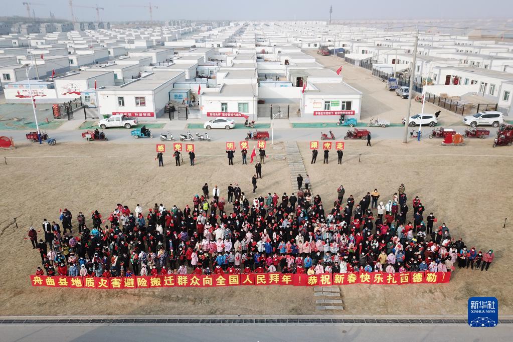 在蘭州新區(qū)舟曲避險(xiǎn)搬遷安置點(diǎn),搬遷群眾向全國(guó)人民拜年(1月24日攝,無(wú)人機(jī)照片)。新華社記者 范培珅 攝
