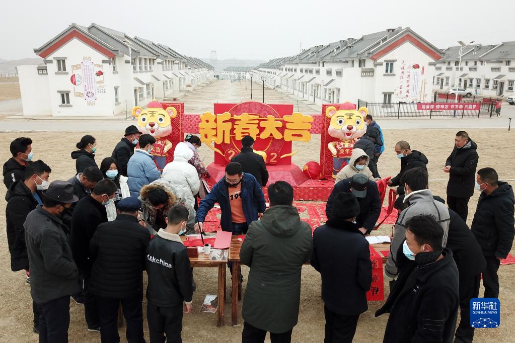 1月25日,在蘭州新區(qū)舟曲避險(xiǎn)搬遷安置點(diǎn),舟曲地質(zhì)災(zāi)害避險(xiǎn)搬遷第一臨時(shí)黨支部組織書(shū)法家給搬遷群眾送春聯(lián)(無(wú)人機(jī)照片)。新華社記者 范培珅 攝