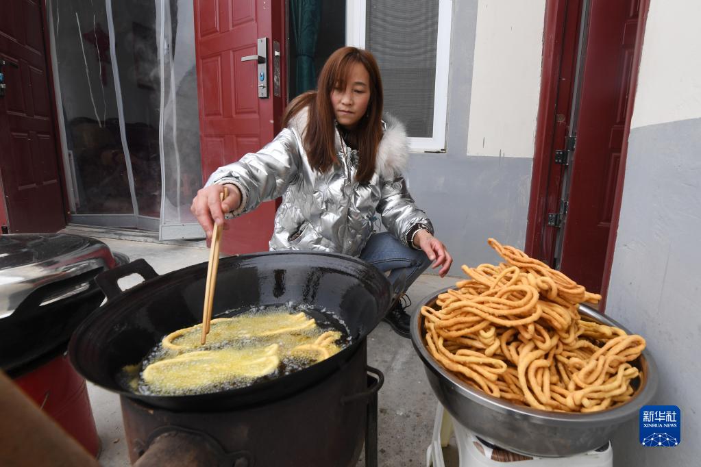 1月25日,在蘭州新區(qū)舟曲避險(xiǎn)搬遷安置點(diǎn),搬遷群眾制作美食。新華社記者 范培珅 攝