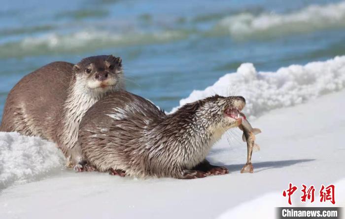 圖為鳥類調(diào)查期間,偶遇水獺母子在河邊捕魚。青海多美生態(tài)環(huán)??萍加邢薰?供圖