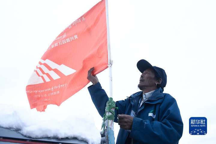 2021年10月20日,在青海省果洛藏族自治州瑪多縣扎陵湖鄉(xiāng)勒那村,三江源國家公園黃河源園區(qū)生態(tài)管護員安才在整理管護隊旗幟。新華社記者 張龍 攝
