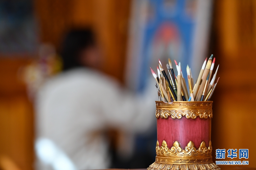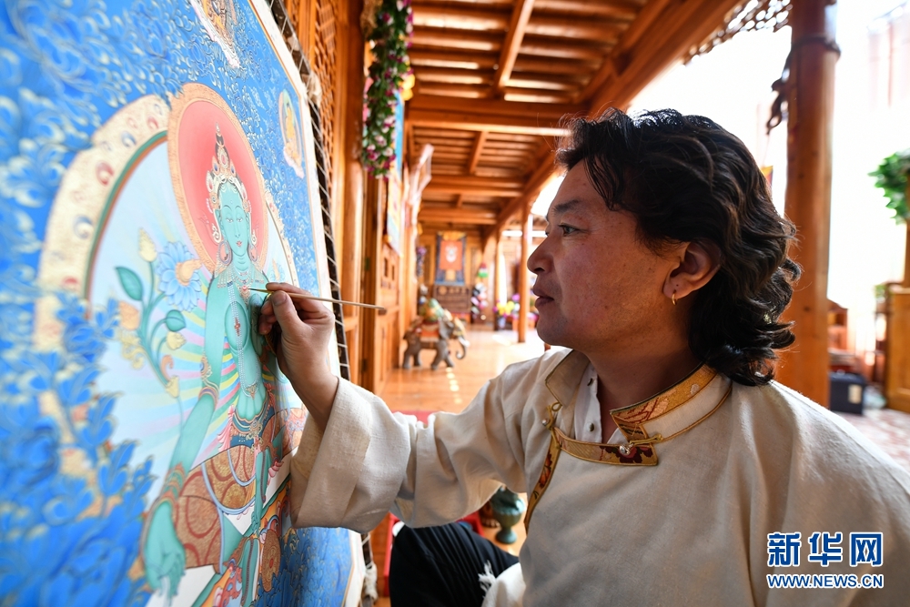 為了更好地傳承和發(fā)揚(yáng)熱貢唐卡繪畫技藝,格桑嘉措又相繼拜多名唐卡大師為師,虛心接受指導(dǎo),刻苦練習(xí)唐卡技藝,將大師們高超的繪畫技藝與家傳技藝融會(huì)貫通,使得他的繪畫功底得到了很大的提升。圖為格桑嘉措在繪制唐卡作品。