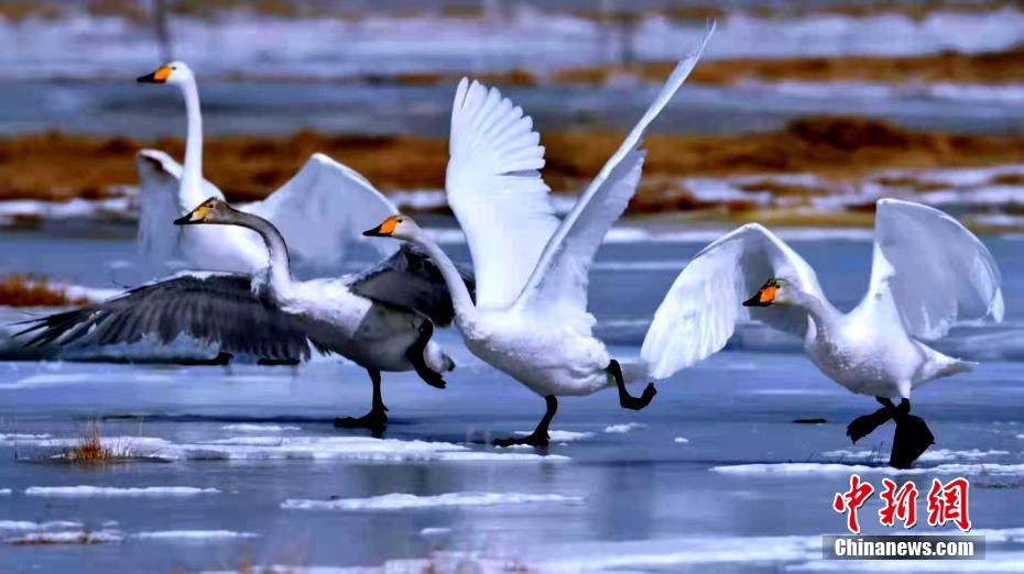 春風時節(jié),上百只天鵝在柴達木盆地可魯克湖翩翩起舞。在碧波蕩漾的湖水中,大天鵝、灰鶴等野生鳥類時而翩翩起舞,時而振翅高飛,時而低空盤旋,為春日的可魯克湖增添了一份美麗與靈動,呈現(xiàn)出一幅五彩繽紛的生態(tài)之美畫卷。