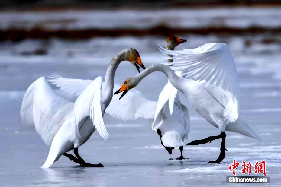 圖為三只天鵝在冰面上嬉戲。 戴永峰 攝