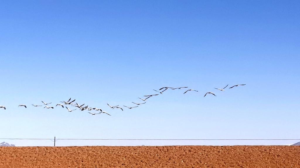 蓑羽鶴生性機警,記者所乘車輛在約百米遠處剛停下,成群的蓑羽鶴便展翅高飛,發(fā)出陣陣鳴叫,急急地向東北方向飛去。