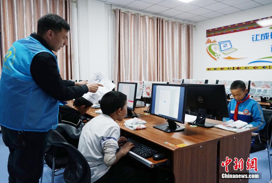 圖為志愿者輔導(dǎo)孩子們學(xué)習(xí)電腦打字。馬銘言 攝