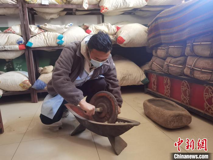 圖為丁增扎西碾制藏藥。 潘雨潔 攝