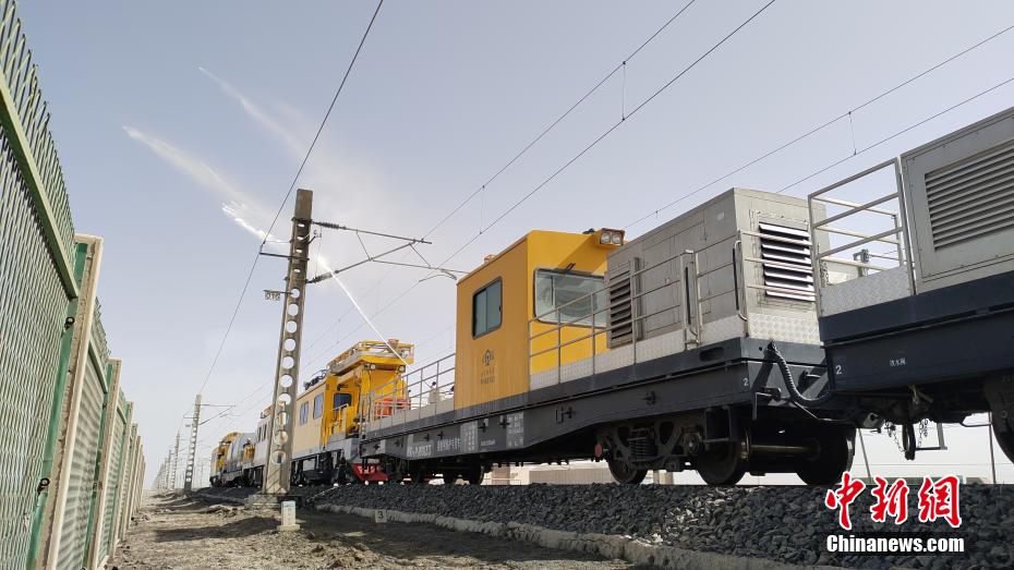 察爾汗鹽湖區(qū)域空氣中鹽分含量高,在這片區(qū)域,春秋季大風(fēng)不僅揚(yáng)沙還會(huì)揚(yáng)鹽,很容易在鐵路牽引供電接觸網(wǎng)設(shè)備上形成鹽污,造成線路跳閘,遇到雨雪天氣就會(huì)放電,造成大面積跳閘,誘發(fā)行車安全事故。圖為接觸網(wǎng)工操作水炮進(jìn)行清洗作業(yè)。 王文誠 攝