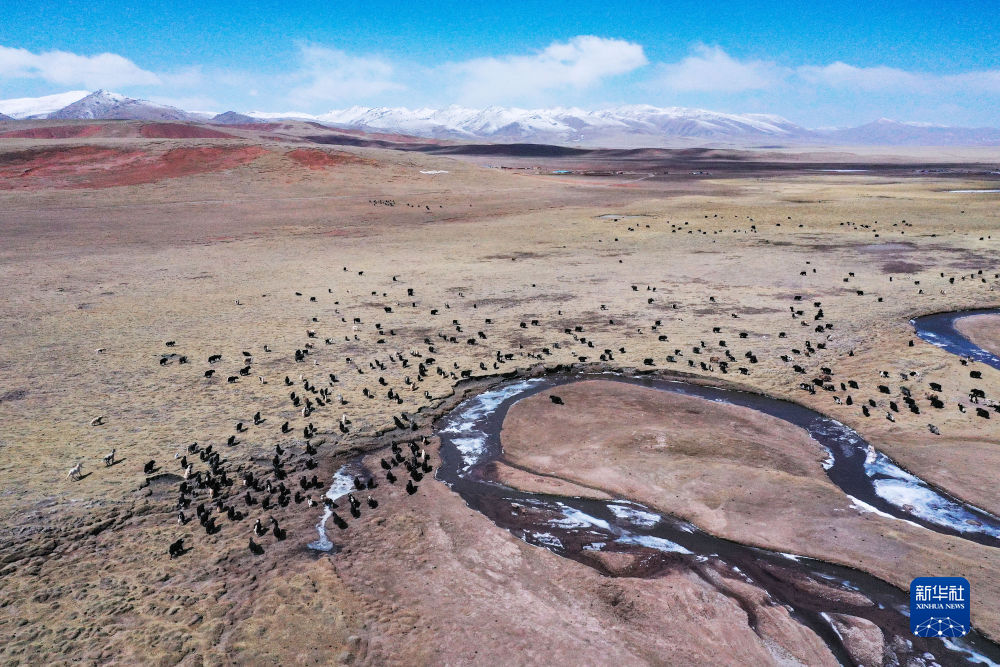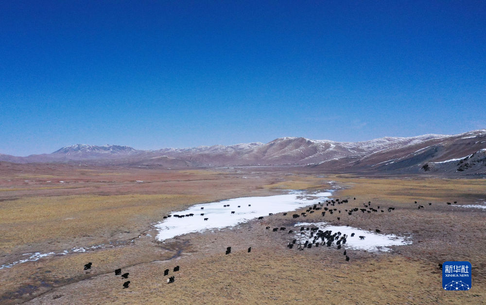 4月19日,在青海省玉樹藏族自治州曲麻萊縣,牦牛在草原上覓食(無人機(jī)照片)。新華社記者 張龍 攝