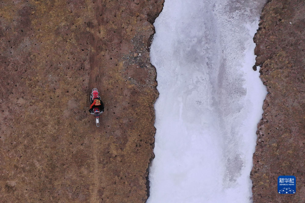 4月21日,在青海省玉樹藏族自治州曲麻萊縣麻多鄉(xiāng)約古宗列曲附近,生態(tài)管護(hù)員在巡護(hù)(無人機(jī)照片)。新華社記者 張龍 攝