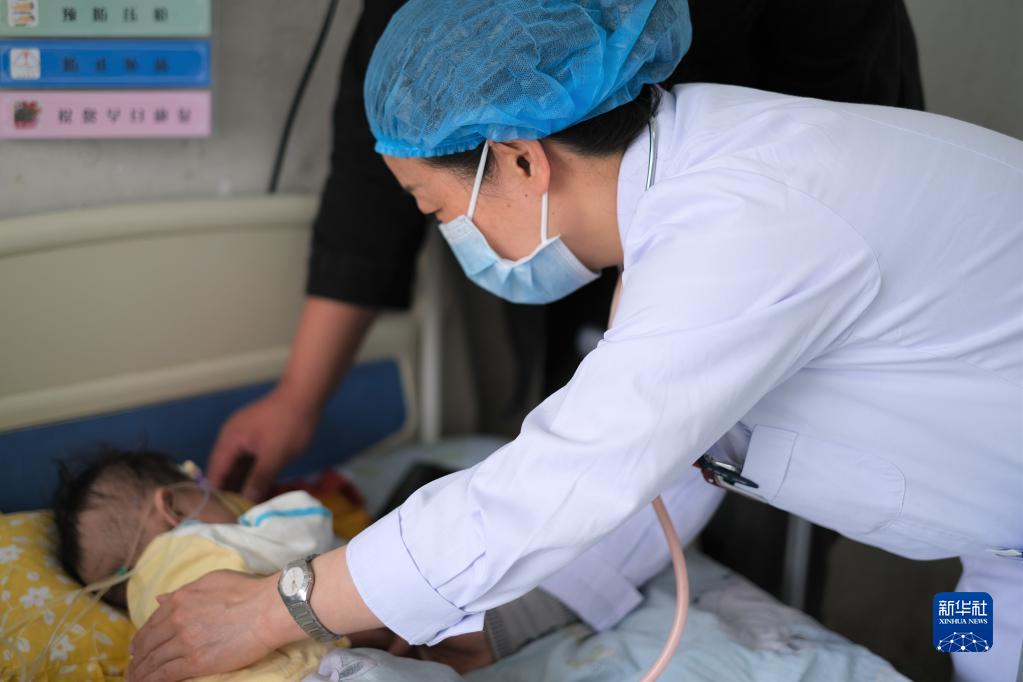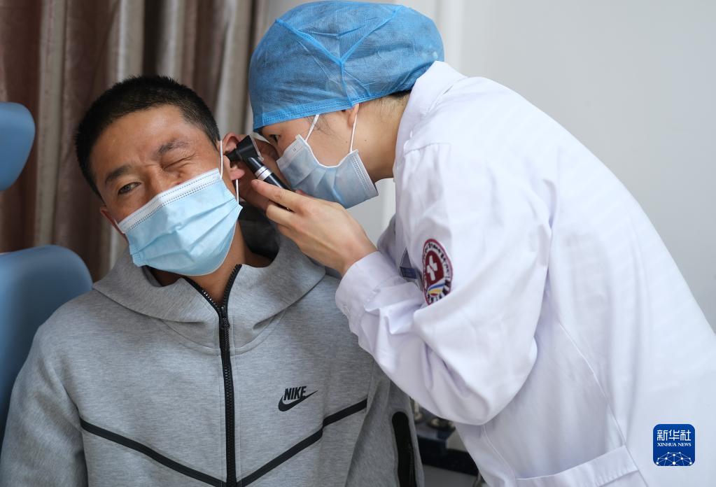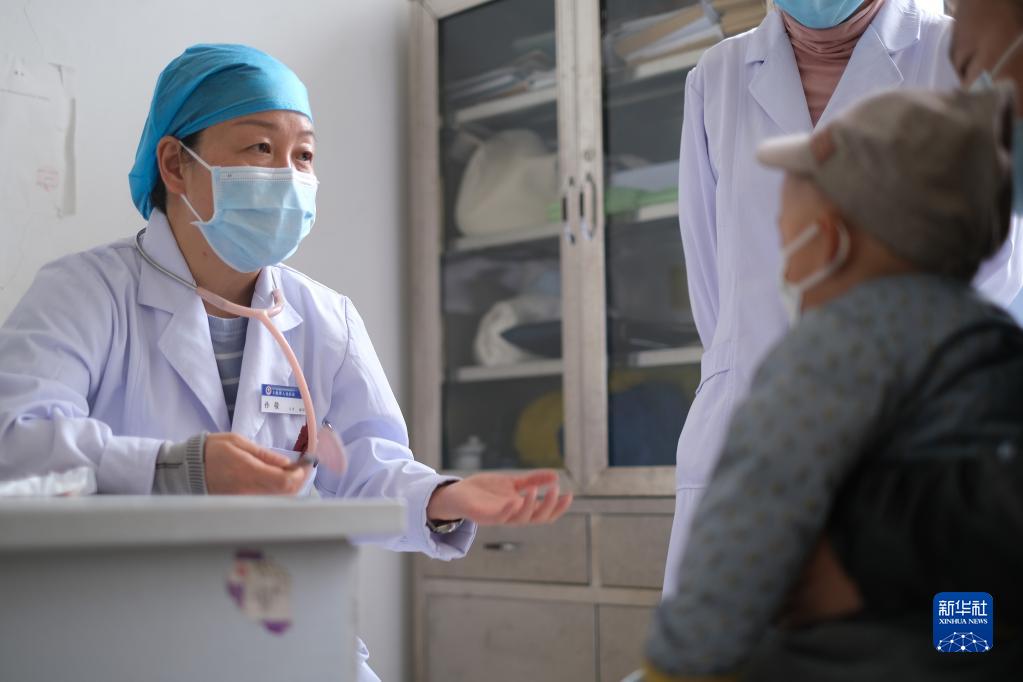 4月25日,青海省婦女兒童醫(yī)院醫(yī)生、青南支醫(yī)隊(duì)員孫敬在青海省玉樹(shù)藏族自治州人民醫(yī)院給患者檢查身體。新華社記者 韓方方 攝