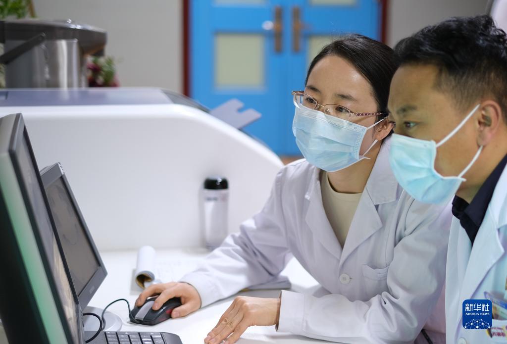 4月25日,青海省婦女兒童醫(yī)院醫(yī)生、青南支醫(yī)隊(duì)員孫敬(左)給青海省玉樹(shù)藏族自治州人民醫(yī)院醫(yī)生講解患者胸部CT。新華社記者 央秀達(dá)珍 攝
