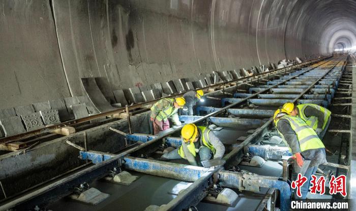 隧道內(nèi)工人師傅正在進(jìn)行無(wú)砟道床施工。劉忠俊 攝