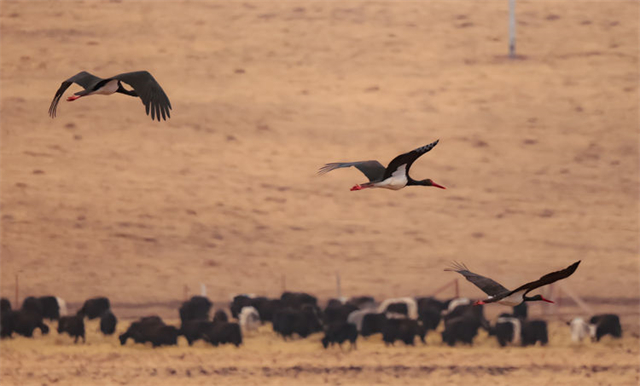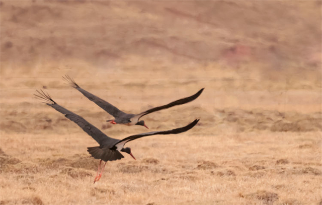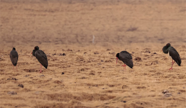 近日,有攝影師在祁連山國家公園亂海子濕地拍攝記錄到4只國家一級重點(diǎn)保護(hù)野生動物——黑鸛,它們時而低頭覓食、時而展翅飛翔。黑鸛是一種體態(tài)優(yōu)美、體色鮮明、性情機(jī)警的大型涉禽,屬世界瀕危鳥類之一,在中國僅有1000多只,珍稀程度不亞于大熊貓,因此也有“鳥中大熊貓”之稱。