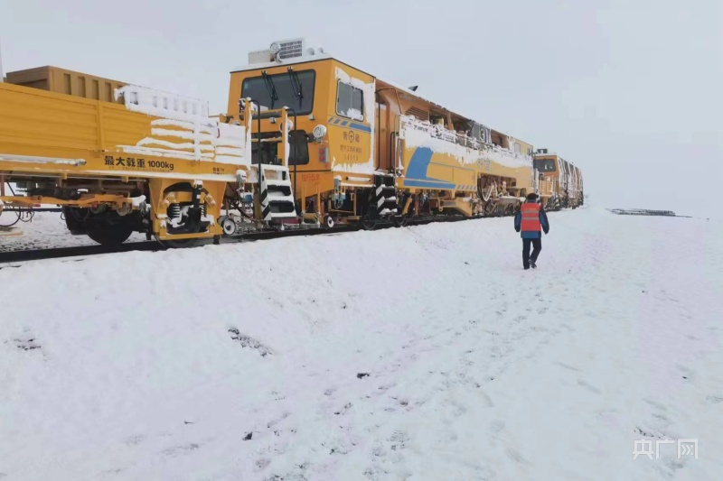 昆侖山上,氣溫驟降,多處施工現(xiàn)場(chǎng)被大雪覆蓋,一片白雪皚皚。為確保施工順利進(jìn)行,近日,西寧工務(wù)機(jī)械段維修三車間的職工們開啟了對(duì)青藏鐵路格拉線望昆——昆侖山區(qū)間大機(jī)搗固施工作業(yè)。西寧工務(wù)機(jī)械段維修三車間主任王海峰在施工作業(yè)前,帶領(lǐng)車間職工清理積雪,同時(shí)對(duì)低溫狀態(tài)易發(fā)生故障的作業(yè)裝置進(jìn)行針對(duì)性保養(yǎng)?!白⒁饽_下積雪濕滑,扶穩(wěn)抓牢,保證自身人身安全。”車間副主任張小波提醒說(shuō)。