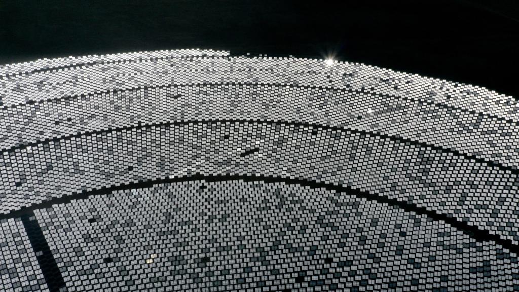 這是2021年3月3日拍攝的位于青海省海南藏族自治州共和縣光伏產(chǎn)業(yè)園內(nèi)的一處塔式光熱發(fā)電項(xiàng)目(無(wú)人機(jī)照片)。新華社記者 張宏祥 攝