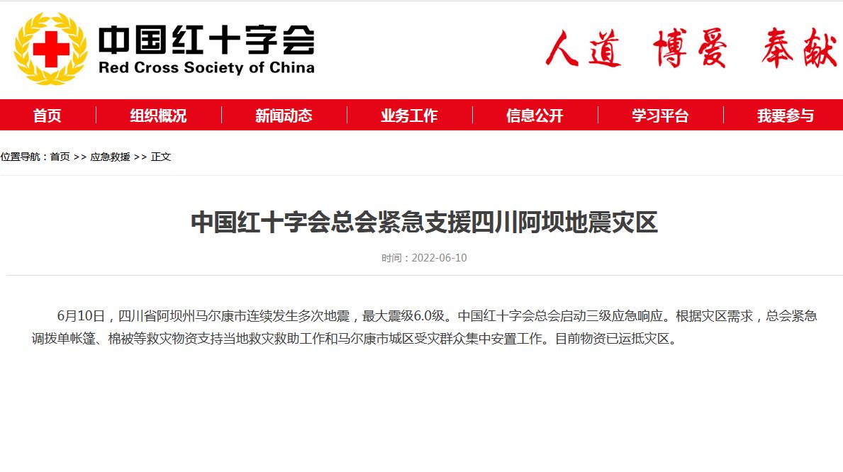 據(jù)中國紅十字會(huì)網(wǎng)站10日消息,6月10日,四川省阿壩州馬爾康市連續(xù)發(fā)生多次地震,最大震級(jí)6.0級(jí)。中國紅十字會(huì)總會(huì)啟動(dòng)三級(jí)應(yīng)急響應(yīng)。根據(jù)災(zāi)區(qū)需求,總會(huì)緊急調(diào)撥單帳篷、棉被等救災(zāi)物資支持當(dāng)?shù)鼐葹?zāi)救助工作和馬爾康市城區(qū)受災(zāi)群眾集中安置工作。目前物資已運(yùn)抵災(zāi)區(qū)。