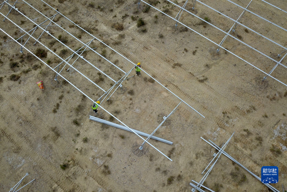 6月7日,在國家電投集團(tuán)黃河公司德令哈220萬千瓦多能互補項目一期100萬千瓦光伏項目建設(shè)現(xiàn)場,工人安裝光伏支架(無人機(jī)照片)。新華社記者 范培珅 攝