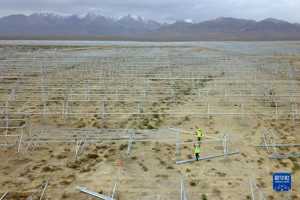 6月7日,在國家電投集團(tuán)黃河公司德令哈220萬千瓦多能互補項目一期100萬千瓦光伏項目建設(shè)現(xiàn)場,工人在安裝光伏支架。新華社記者 王浡 攝