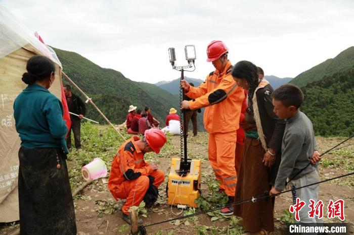 震中草登鄉(xiāng)斯拉爾底村三組安置點(diǎn)電力搶險(xiǎn)人員架起照明設(shè)備,最后一個(gè)停電的受災(zāi)村莊燈亮了。張懿玲 攝