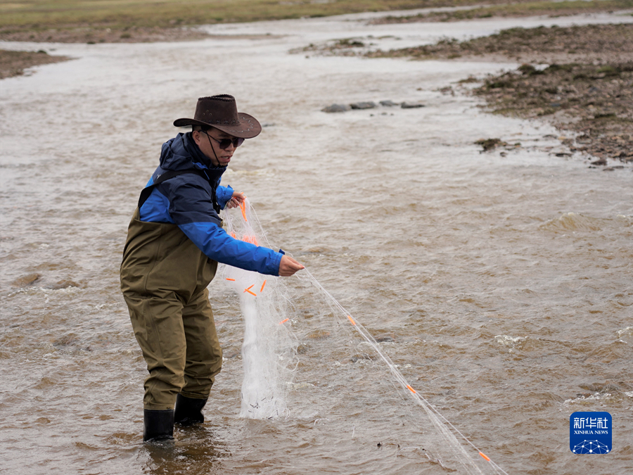 6月12日,李偉在長江南源當曲河畔采集發(fā)育成熟的小頭裸裂尻魚。新華社記者 陳杰 攝