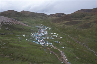 理塘縣共有8個蟲草產(chǎn)區(qū),阿加溝最大。這片山谷基礎(chǔ)設(shè)施已經(jīng)“不錯”,營地道路水泥硬化,兩條土公路修上了海拔5000米的山里。蟲草“淘金者”的主營地在一片開闊的山谷里,三面環(huán)山,山上覆著的一層淺綠的草甸。