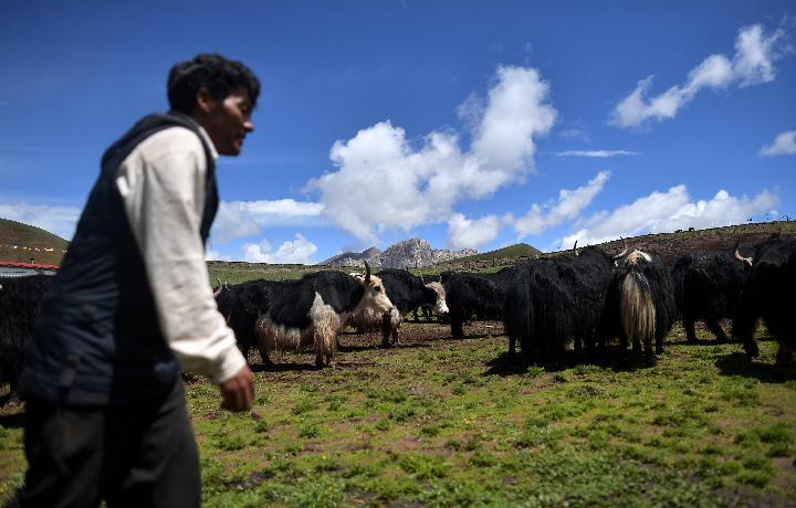 優(yōu)美村生態(tài)畜牧業(yè)專(zhuān)業(yè)合作社牧工準(zhǔn)備將牦牛趕往夏季草場(chǎng)。新華社記者 張宏祥 攝