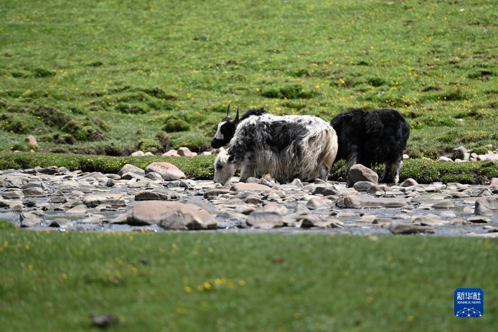 在稱多縣歇武鎮(zhèn)牧業(yè)村,牦牛在河邊飲水(7月4日攝)。新華社記者 范培珅 攝