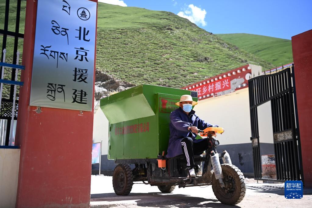 在稱多縣歇武鎮(zhèn)牧業(yè)村的牦牛養(yǎng)殖基地,工作人員駕駛自動撒料車給牦牛喂草(7月4日攝)。新華社記者 范培珅 攝