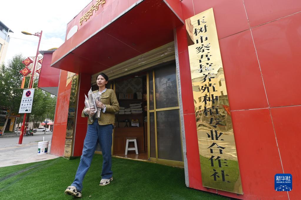 7月10日,代青永措走出玉樹市察吾拉養(yǎng)殖種植專業(yè)合作社店鋪。 新華社記者 范培珅 攝