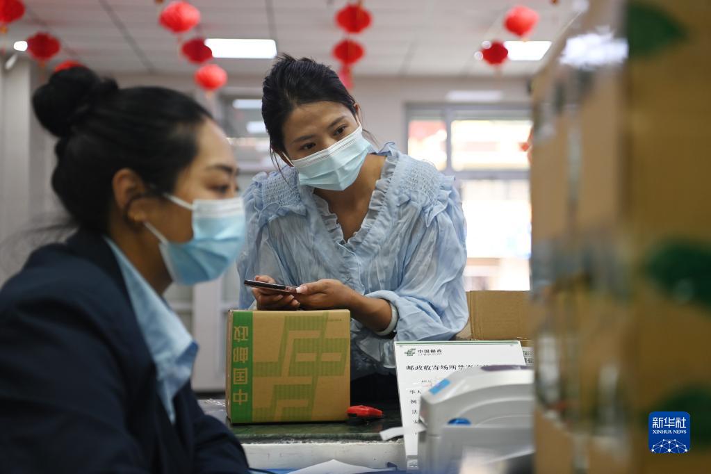 7月12日,在中國郵政儲蓄銀行股份有限公司玉樹藏族自治州結(jié)古大道營業(yè)所,代青永措(右)給線上訂單顧客發(fā)快遞。 新華社記者 范培珅 攝
