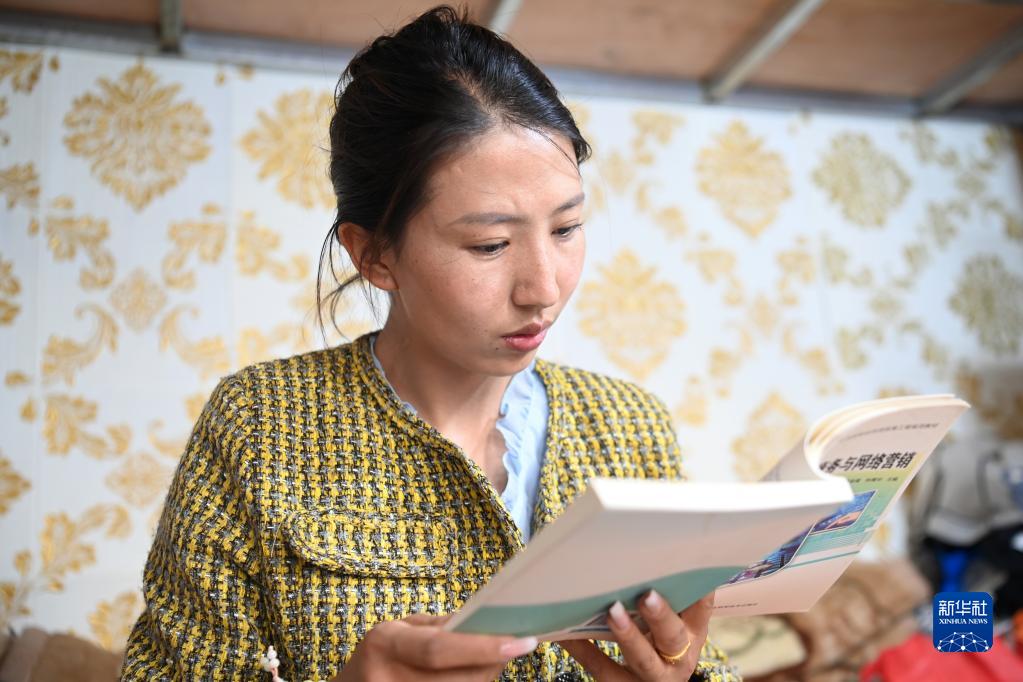 7月12日,在玉樹市察吾拉養(yǎng)殖種植專業(yè)合作社店鋪,代青永措閑暇之余看書學(xué)習(xí)。 新華社記者 范培珅 攝