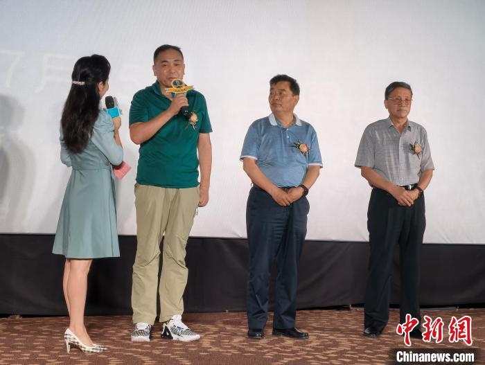 圖為總導(dǎo)演李曉、主演葛玉修,參與電影創(chuàng)作的廣電協(xié)會(huì)會(huì)長(zhǎng)韓青峰接受采訪。祁增蓓 攝