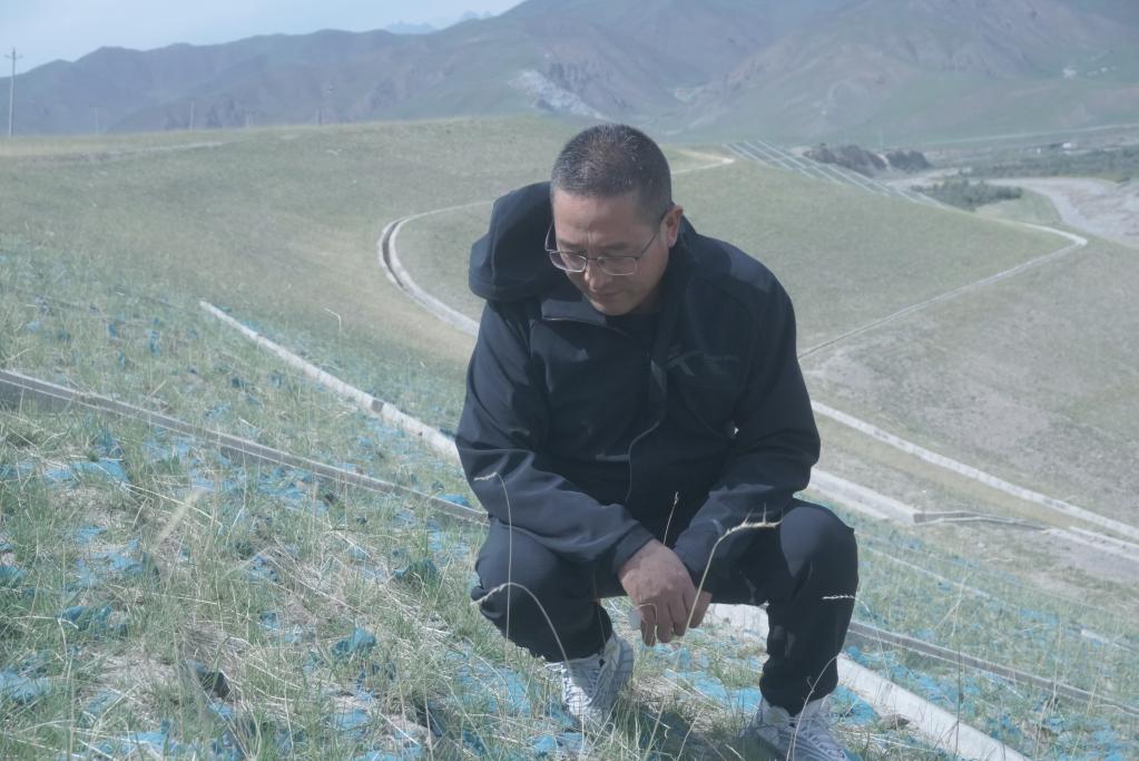 6月16日,祁連縣山水林田湖試點(diǎn)項(xiàng)目辦公室干部楊富存正在小八寶河河畔查看治理成效。新華社記者 周盛盛 攝