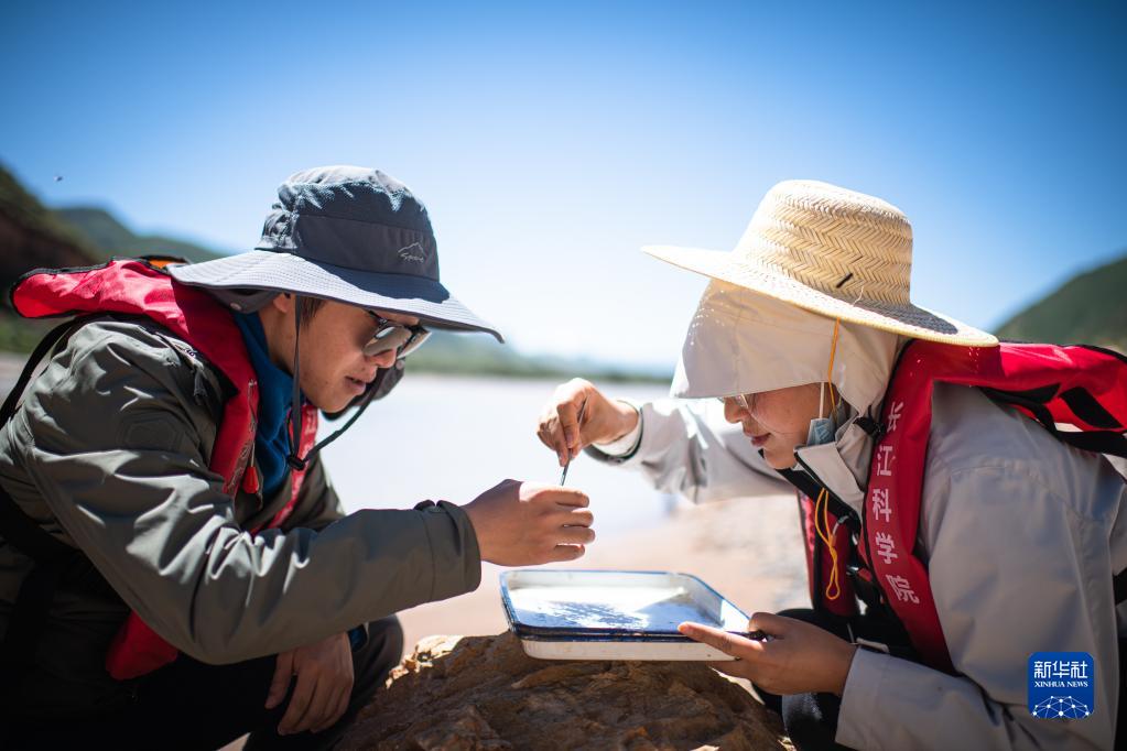 7月24日,長(zhǎng)江科學(xué)院科考隊(duì)員劉晗(右)在瀾滄江源區(qū)的扎曲采集魚類樣本。新華社記者 肖藝九 攝