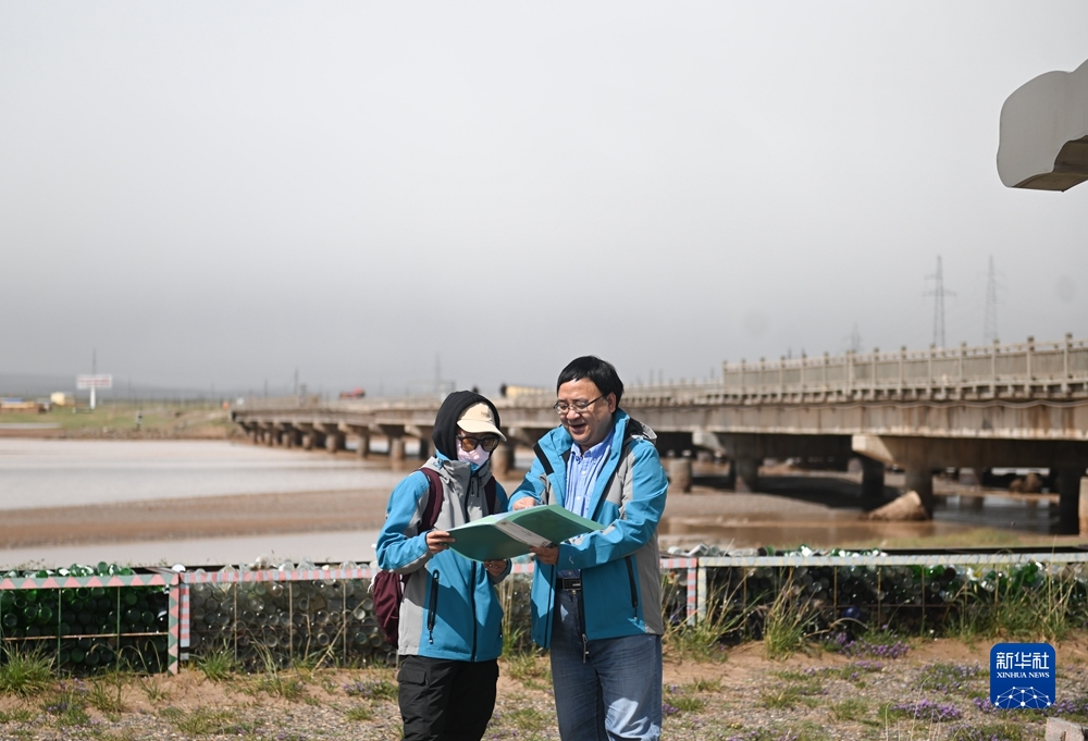 在長(zhǎng)江源地區(qū),焦弘睿(左)與導(dǎo)師在查看江源地區(qū)的資料。新華社記者 張龍攝