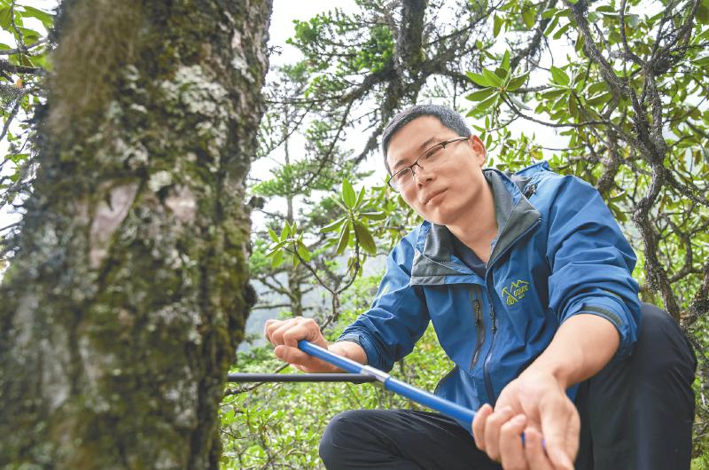 垂直距離只有300米,但密林中的行進(jìn)并不容易。在向?qū)ьI(lǐng)下,王文志和其學(xué)生抵達(dá)了林線處,腳踩松軟的苔蘚,他們展開(kāi)作業(yè)。