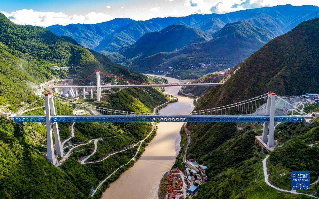 7月27日拍攝的麗香鐵路金沙江特大橋(無人機照片)。大橋左邊連接哈巴雪山隧道,右邊連接玉龍雪山隧道。新華社記者 陳欣波 攝