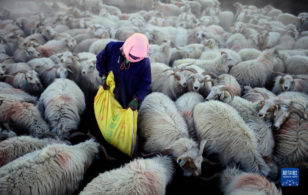 在青海省海北藏族自治州剛察縣沙柳河鎮(zhèn)新海村,牧民彭毛卓瑪在給自家羊群喂飼料(2017年11月29日攝)。新華社記者 張宏祥 攝