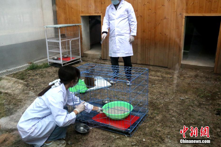 圖為“奶爸”“奶媽”給國(guó)家一級(jí)重點(diǎn)保護(hù)野生動(dòng)物荒漠貓換貓砂。 張?zhí)砀?攝