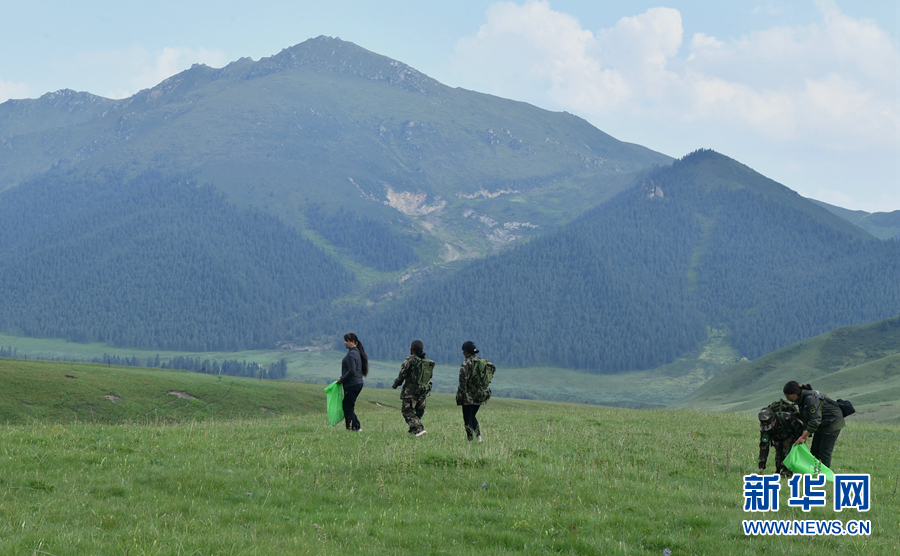 圖為祁連山國家公園青海片區(qū)青陽溝管護站生態(tài)管護員在草原上撿拾垃圾。新華網(wǎng) 卡婭梅朵 攝
