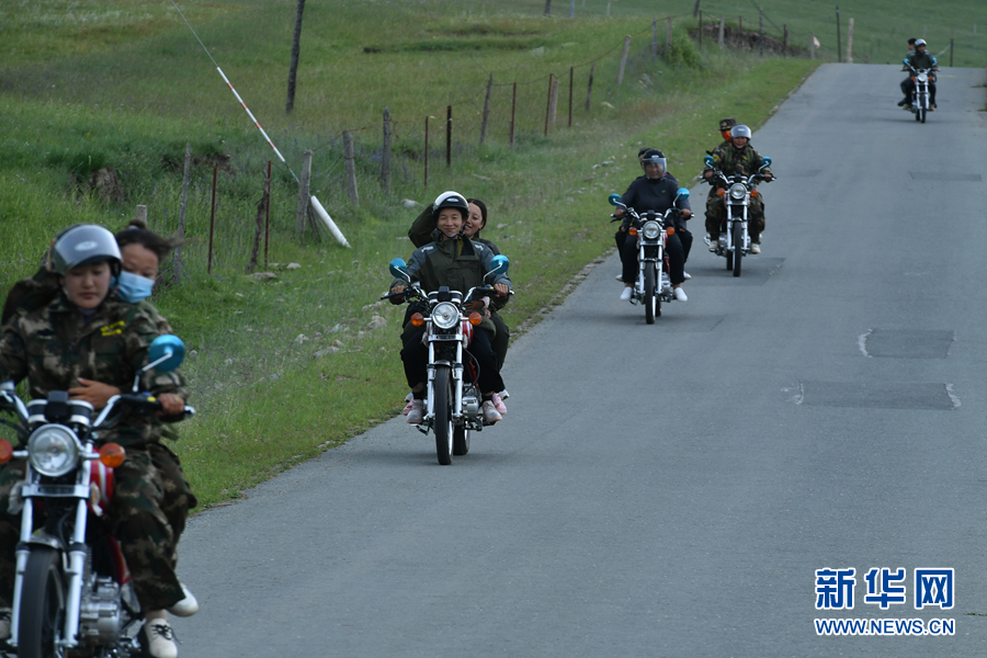 圖為代吉桑毛和隊員們準(zhǔn)備騎摩托車出發(fā)。新華網(wǎng) 卡婭梅朵 攝