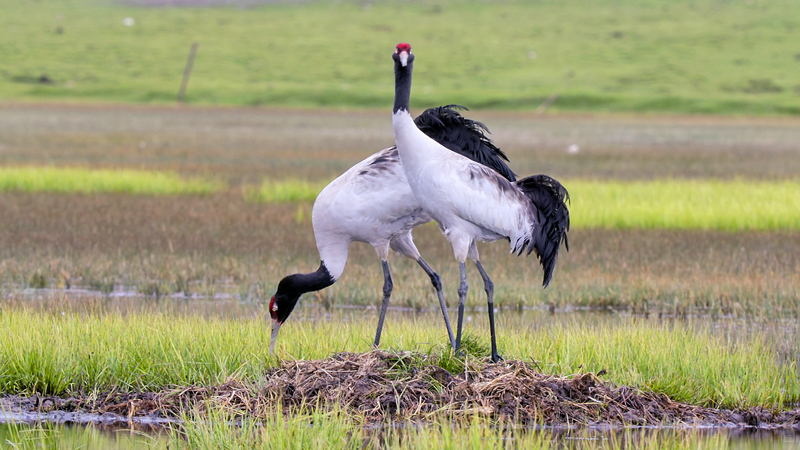 通常每年3月底至4月初,黑頸鶴都會(huì)飛到繁殖地?fù)衽冀慌洌缓笤诟咴瓭竦?、那灘、四面環(huán)水的草墩、蘆葦叢或地面營(yíng)巢。5月至7月是黑頸鶴繁殖的時(shí)間,黑頸鶴通常每窩會(huì)產(chǎn)2枚卵,第1枚卵產(chǎn)下后就開(kāi)始孵化。孵化由夫婦共同輪流承擔(dān),一只孵卵,另外一只就會(huì)在巢穴附近“巡邏”,以保證黑頸鶴寶寶的安全“出生”。鶴卵孵化出幼鶴,大約需要一個(gè)月的時(shí)間。