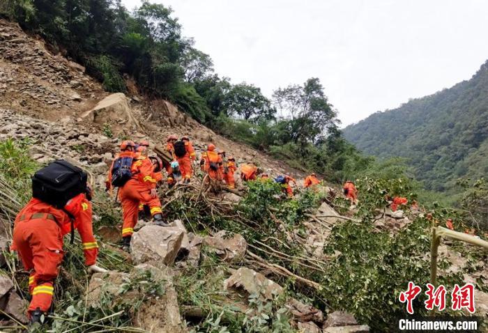 救援力量通過(guò)山體垮塌路段。四川森林消防供圖