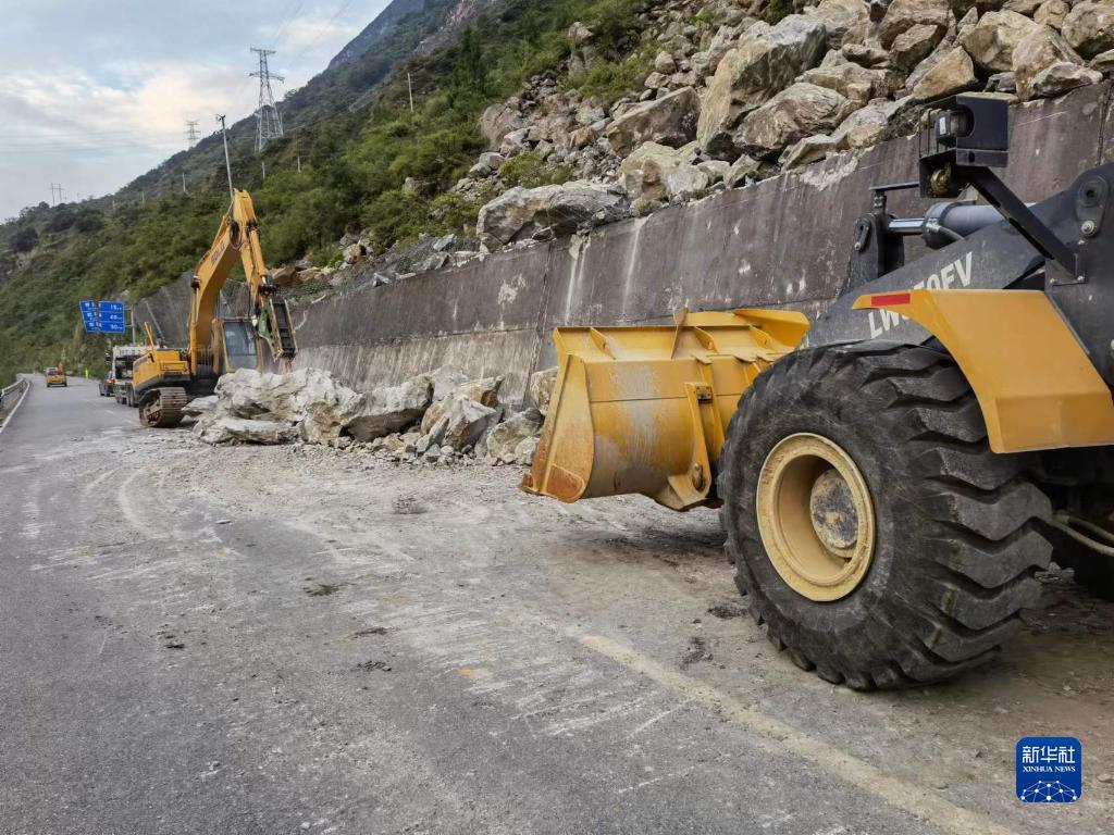 9月6日上午,工程機械在省道S217線瀘石路快速通道K30二里壩段進行搶通作業(yè)。新華社發(fā)