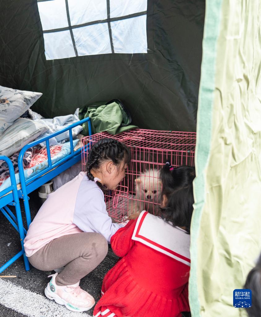 9月6日,在四川甘孜州瀘定縣磨西鎮(zhèn)海螺溝廣場受災群眾臨時安置點,兒童與從家中帶過來的小狗玩耍。新華社記者 才揚 攝