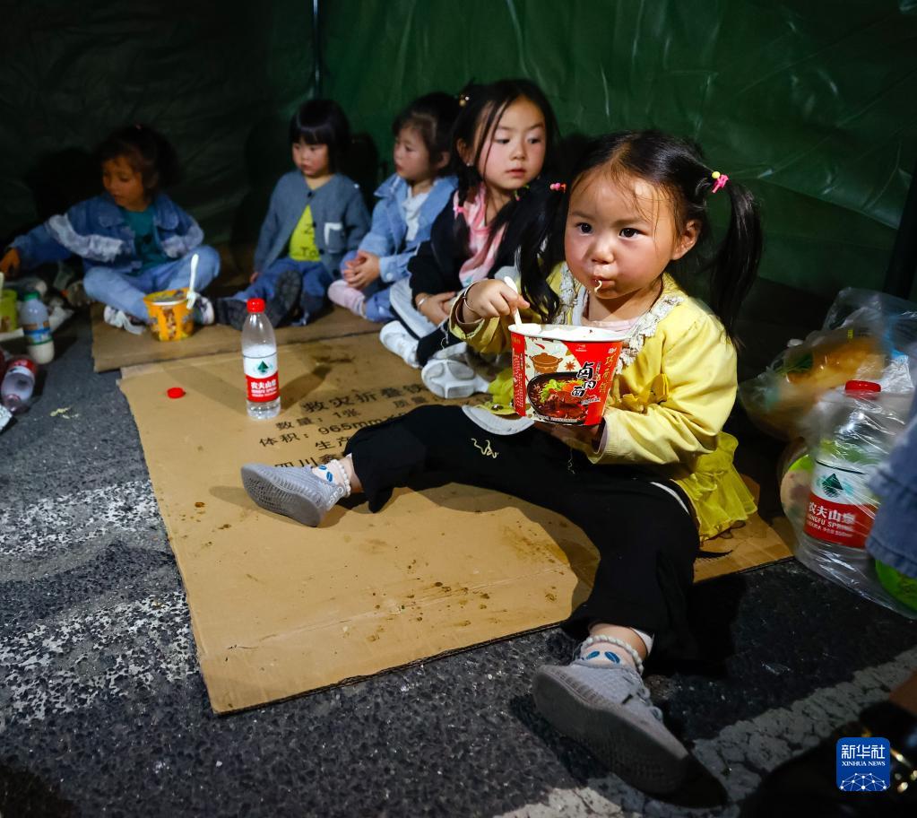 9月5日晚,在四川甘孜州瀘定縣磨西鎮(zhèn)的受災(zāi)群眾臨時(shí)安置點(diǎn),幾個(gè)家庭的孩子們在一個(gè)帳篷里吃飯、休息。新華社 沈伯韓 攝