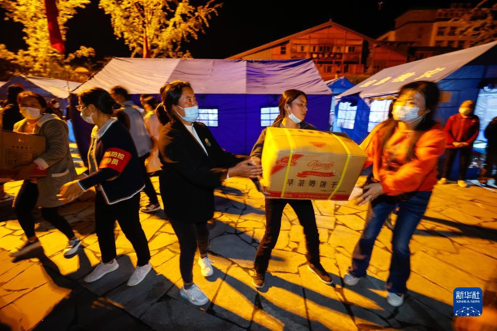 9月5日晚,在四川甘孜州瀘定縣磨西鎮(zhèn)的受災(zāi)群眾臨時(shí)安置點(diǎn),人們在傳遞救災(zāi)物資。新華社 沈伯韓 攝